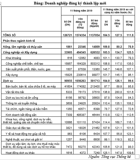 Tính chung 11 tháng năm 2019, cả nước có 126,7 nghìn doanh nghiệp đăng ký thành lập mới với tổng số vốn đăng ký là 1.574,4 nghìn tỷ đồng và tổng số lao động đăng ký là 1.137,1 nghìn lao động, tăng 4,5% về số doanh nghiệp, tăng 27,5% về vốn đăng ký và tăng 11,8% về số lao động so với cùng kỳ năm 2018. Vốn đăng ký bình quân một doanh nghiệp thành lập mới trong 11 tháng đạt 12,4 tỷ đồng, tăng 22% so với cùng kỳ năm trước. Nếu tính cả 2.101,3 nghìn tỷ đồng vốn đăng ký tăng thêm của 36,5 nghìn doanh nghiệp thay đổi tăng vốn thì tổng số vốn đăng ký bổ sung vào nền kinh tế trong 11 tháng năm 2019 là 3.675,7 nghìn tỷ đồng.