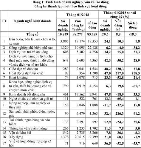 Theo báo cáo của Cục Quản lý Đăng ký Kinh doanh, Bộ Kế hoạch và Đầu tư, tháng 1/2018, số doanh nghiệp thành lập mới của cả nước là 10.839 doanh nghiệp, tăng 20,6% và số vốn đăng ký là 98.272 tỷ đồng, tăng 8,9% so với cùng kỳ năm 2017.