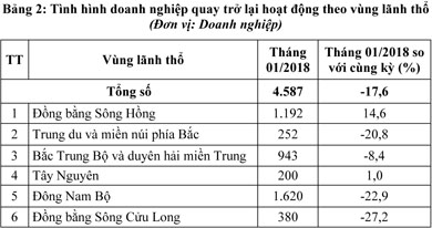 Đối với số doanh nghiệp quay trở lại hoạt động, trong tháng 01/2018 có 4.587 doanh nghiệp, giảm 17,6% so với cùng kỳ năm trước. Theo đó, tỷ lệ doanh nghiệp quay trở lại hoạt động đều có xu hướng giảm trên cả nước so với cùng kỳ năm ngoái, Tây Nguyên là khu vực có mức gia tăng duy nhất, tuy nhiên mức độ gia tăng cũng chỉ đạt ở mức thấp với 1,0% (Bảng 2).