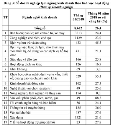 Theo lĩnh vực hoạt động, trong tháng 01/2018, số lượng doanh nghiệp tạm ngừng kinh doanh tập trung chủ yếu ở những ngành kinh tế, như: Bán buôn; bán lẻ; sửa chữa ô tô, xe máy; Xây dựng; Công nghiệp chế biến, chế tạo (Bảng 3).