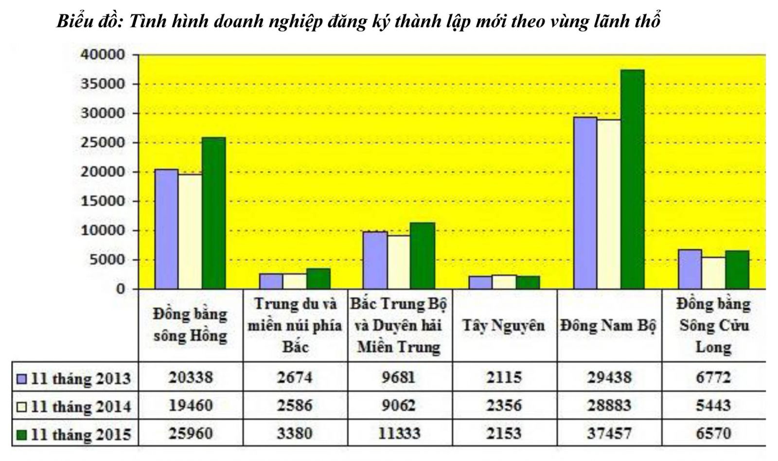 Tính chung 11 tháng đầu năm 2015, cả nước có 86.853 doanh nghiệp được thành lập mới với tổng số vốn đăng ký là 538.671 tỷ đồng, tăng 28,12% về số doanh nghiệp và tăng 37,66% về số vốn đăng ký so với cùng kỳ năm trước. Số lao động dự kiến được tạo việc làm của các doanh nghiệp này là 1.318,4 nghìn lao động, tăng 32,9% so với cùng kỳ năm trước.