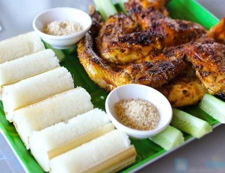 Đã có cơm lam thì không thể thiếu gà nướng lửa hồng đậm chất xứ sở đại ngàn, Gà nướng ăn với cơm lam là một trong những đặc sản núi rừng nổi tiếng của người đồng bào Tây Nguyên. Theo người địa phương, món ăn có xuất phát từ đồng bào dân tộc Ê Đê ở Buôn Đôn, Đắk Lắk. Sau này, đặc sản được người dân Tây Nguyên chế biến với nhiều phiên bản khác nhau. Gà nướng phải là gà chạy bộ, cho thịt săn chắc, lớp da mỏng giòn sau khi nướng sẽ không khiến thực khách cảm thấy ngấy mỡ. Gà đem đãi khách thường là gà tơ chỉ nặng trên dưới 1 kg. Qua sơ chế, gà nguyên con được ướp cùng các loại gia vị như sả, hành tím, tỏi giã nhuyễn, ngũ vị hương, mật ong, tiêu, nước mắm, muối và các loại lá rừng... trước khi kẹp que tre và nướng.Đầu bếp phải trở gà thật đều tay để thịt chín tới, và liên tục thêm than để đảm bảo lửa vừa vặn, Quanh bếp than hồng tự chế, những con gà kẹp que tre cháy xèo xèo, mùi thịt chín thơm theo khói lan toả cả một góc sân, Gà nướng không thể thiếu chén muối lá é, một loại lá có mùi thơm gần như húng quế. Chén muối chấm không quá cầu kỳ, nhưng lại quện vị thêm hương cho thịt gà.