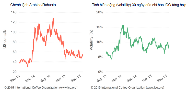 Tất cả 4 chỉ báo nhóm đều dịch chuyển xuống thấp hơn so với tháng 8 với mức giảm mạnh nhất ghi nhận ở 3 nhóm cà phê Arabica. Do đó, chênh kệch Arabica/Robusta so sánh giữa thị trường cà phê tương lai tại New York và London đã giảm xuống mức thấp nhất 20 tháng qua, tại mức 50,13 cent/lb, thấp hơn 50% so với cùng kỳ năm ngoái.