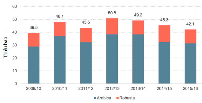 Sản lượng cà phê Brazil từ niên vụ 2009/10 đến niên vụ 2015/16 - Nguồn: ICO