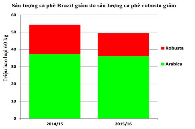 Sản lượng cà phê robusta của Brazil trong niên vụ 2015/16 dự báo giảm 3,7 triệu bao xuống mức 13,3 triệu bao. Năng suất cà phê robusta giảm do lượng mưa dưới mức trung bình và nhiệt độ trên mức trung bình tại bang Espirito Santo, nơi phần lớn diện tích trồng cà phê robusta. Sản lượng cà phê arabica của Brazil dự báo giảm 1,2 triệu bao xuống mức 36,1 triệu bao do năng suất giảm do ảnh hưởng điều kiện thời tiết khô hạn tại các bang Minas Gerais và Sao Paulo, hai vùng chiếu khoảng 80% tổng sản lượng cà phê toàn Brazil. Tổng hợp sản lượng cà phê arabica và robusta cho biết dự báo sản lượng cà phê Brazil niên vụ 2015/16 giảm 4,9 triệu bao đạt 49,4 triệu bao. Do nguồn cung giảm, xuất khẩu cà phê của Brazil trong niên vụ 2015/16 kỳ vọng giảm 3,1 triệu bao xuống 30,0 triệu bao và tồn kho cà phê cuối niên vụ dự báo giảm 4,2 triệu bao xuống 5,2 triệu bao.