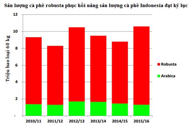 Sản lượng cà phê niên vụ 2015/16 của Indonesia dự báo tăng 1,8% đạt mức kỷ lục 10,6 triệu bao, nhờ sản lượng cà phê robusta phục hồi do điều kiện thời tiết thuận lợi trong giai đoạn cà phê ra hoa. Tuy nhiên giai đoạn này theo sau là thời kỳ lượng mưa dưới mức trung bình khiến cho năng suất cà phê arabica (ra hoa muộn hơn) giảm nhẹ với dự báo sản lượng cà phê arabica giảm 100.000 bao xuống mức 1,3 triệu bao. Xuất khẩu cà phê trong niên vụ hiện tại của Indonesia dự báo phục hồi 400.000 bao lên 5,5 triệu bao do xuất khẩu sang EU tăng trong khi xuất khẩu cà phê hòa tan kỳ vọng tăng 700.000 bao lên 2,6 triệu bao chủ yếu do nhu cầu tiêu thụ mạnh từ Philippines.
