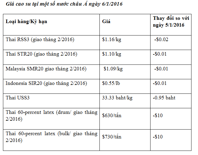 Cao su Thái tại Bangkok, trị giá FOB, giảm 2,3%, xuống còn 42,50 bath/kg, mức thấp nhất kể từ tháng 12/2008, giảm 23% năm 2015.