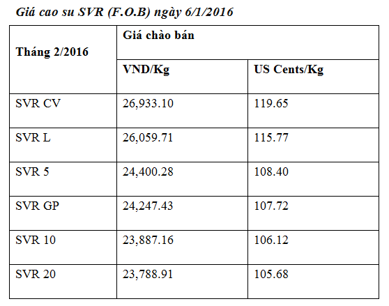 Tại Sở giao dịch hàng hóa Tokyo (TCE), giá cao su kỳ hạn giao tháng 6/2016 đã trượt 1,4%, xuống còn 150,6 yên/kg (tương đương 1.262 USD/tấn), mức thấp nhất đối với các giao dịch kể từ tháng 3/2009. Giá cao su kỳ hạn hợp đồng benchmark đã giảm 25% năm 2015, mức giảm nhiều nhất kể từ năm 2011.