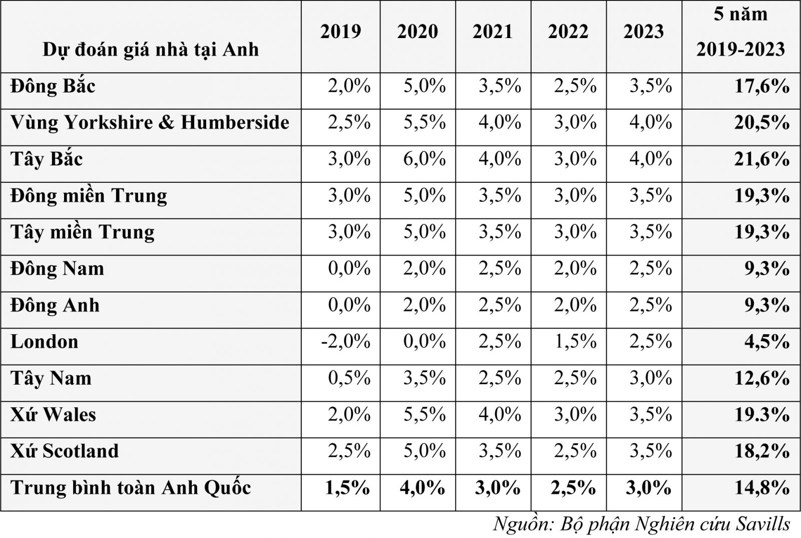 Trong khoảng 2019 - 2023, giá nhà ở Anh sẽ tăng trung bình 14,8% - mức tăng sẽ từ 21,6% tại phía Tây Bắc và giảm dần tại London và phía Nam – đạt chỉ số tăng trưởng tốt nhất kể từ khi suy thoái. Giá trị tài sản của thị trường cao cấp tại London sẽ tăng trưởng mạnh mẽ hơn nhiều, so với lần điều chỉnh giá thị trường vào năm 2014.