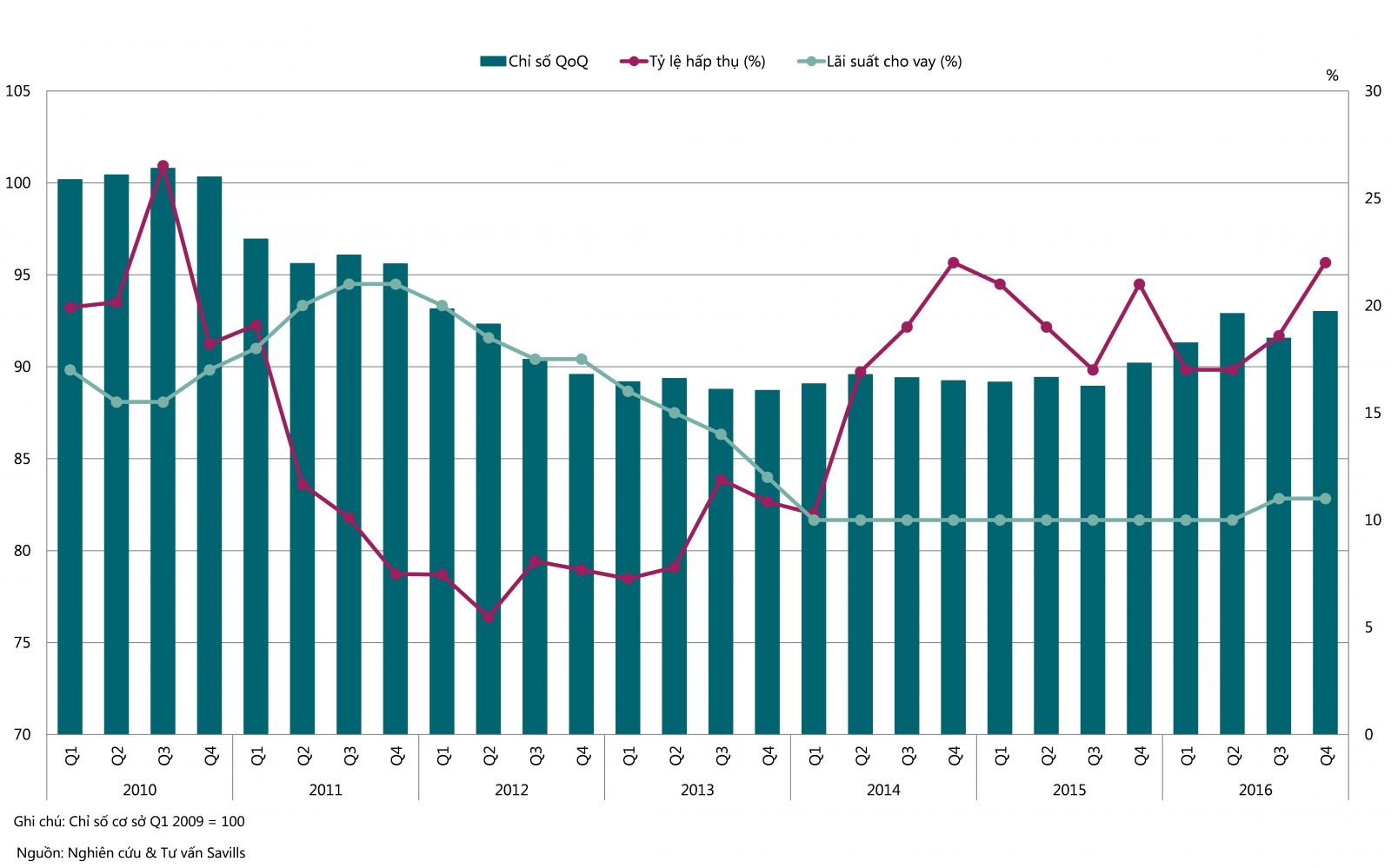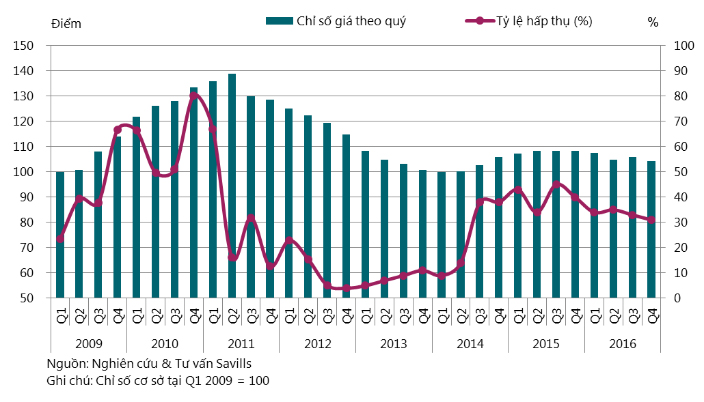 Tỷ lệ hấp thụ khoảng 23%, tăng 4 điểm phần trăm theo quý và 1 điểm phần trăm theo năm. Trong quý IV/2016, có gần 10.200 giao dịch, tăng 36% theo quý và 32% theo năm, cao nhất từ năm 2010. Trong quý này, hạng C tiếp tục hoạt động tốt, chiếm 49% trên tổng lượng giao dịch, hạng B có hơn 4.700 căn được bán, tăng mạnh 60% theo quý và 6% theo năm.