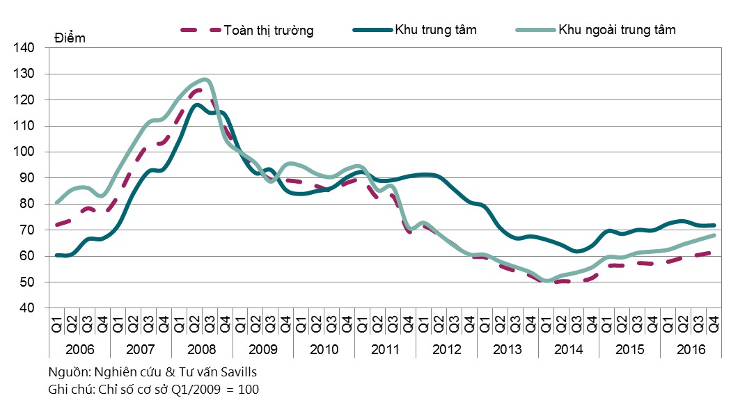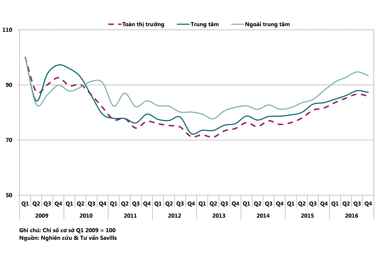 Trong quý IV/2016, chỉ số giá nhà ở khoảng 93, tăng 1 điểm theo quý và 3 điểm theo năm do giá trung bình cao từ những dự án mới mở bán trong năm 2016. Từ năm 2013-2015, chỉ số giá nhà ở không dao động nhiều (Biểu đồ 1).