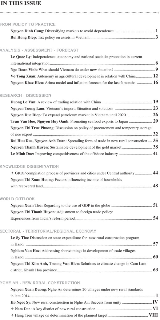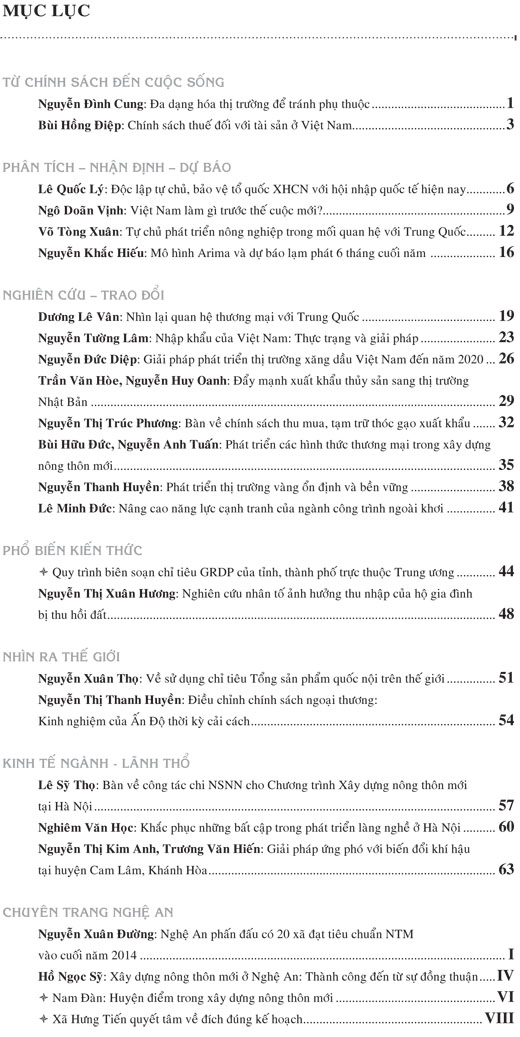 Tạp chí số này còn nhiều bài viết hay về thương mại, thị trường xăng dầu, nông sản... Đặc biệt, “Chuyên trang Nghệ An” trong số này sẽ cho chúng ta thấy những kinh nghiệm, bài học quý báu trong con đường xây dựng Nông thôn mới của Tỉnh mà các địa phương khác có thể học tập./.
