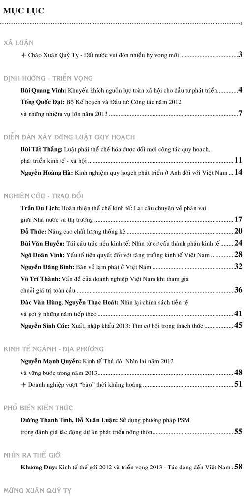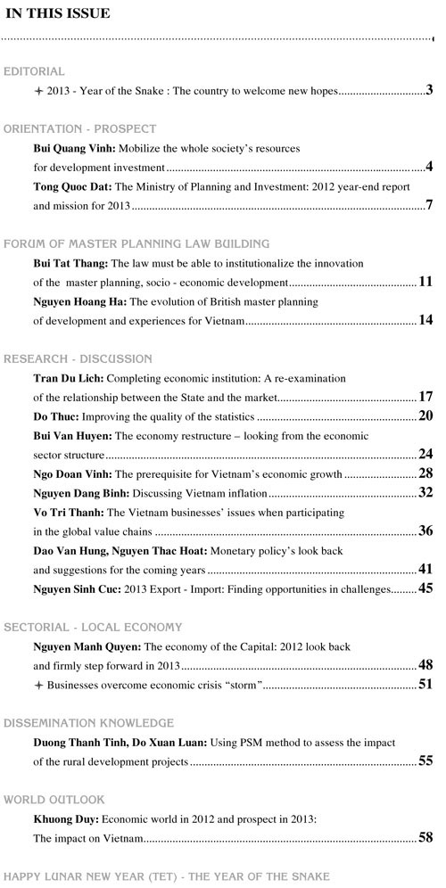 Bài Yếu tố tiên quyết đối với tăng trưởng kinh tế Việt Nam của PGS. TS. Ngô Doãn Vịnh; Bàn về lạm phát ở Việt Nam của TS. Nguyễn Đăng Bình, Vấn đề của doanh nghiệp Việt Nam khi tham gia chuỗi giá trị toàn cầu của TS. Võ Trí Thành; Nhìn lại chính sách tiền tệ và gợi ý những năm tiếp theo của PGS,TS. Đào Văn Hùng và TS. Nguyễn Thạc Hoát; và bài Xuất, nhập khẩu 2013: Tìm cơ hội trong thách thức của PGS,TS. Nguyễn Sinh Cúc sẽ kết thúc chuyên mục. Bạn đọc sẽ tìm được những vấn đề mình quan tâm trong từng bài viết của các chuyên gia.