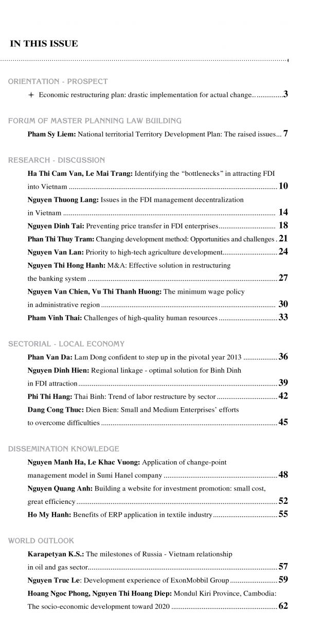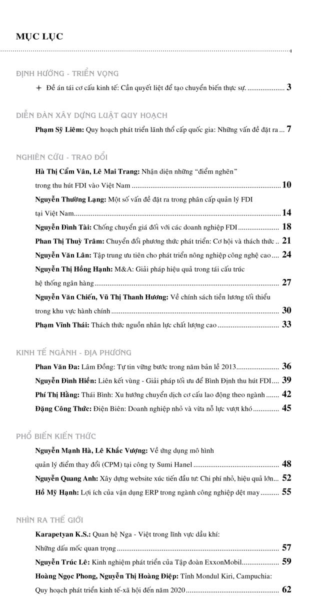 Chuyên mục Kinh tế ngành - Địa phương. Nâng cao chất lượng đầu tư nước ngoài là một yêu cầu mới đang đặt ra ở nước ta hiện nay. Đối với tỉnh Bình Định thực hiện liên kết vùng 7 tỉnh/thành Duyên hải miền Trung (DHMT) được coi là giải pháp mới và quan trọng. Bài viết Liên kết vùng – Giải pháp tối ưu để Bình Định thu hút FDI này tập trung phân tích và luận giải giải pháp trên. Cũng nằm trong chuyên mục này, là một số bài viết như: Lâm Đồng: Tự tin vững bước trong năm bản lề 2013 của tác giả Phan Văn Đa; Thái Bình: Xu hướng chuyển dịch cơ cấu lao động theo ngành của tác giả Phí Thị Hằng;Điện Biên: Doanh nghiệp nhỏ và vừa nỗ lực vượt khó của tác giả Đặng Công Thức.