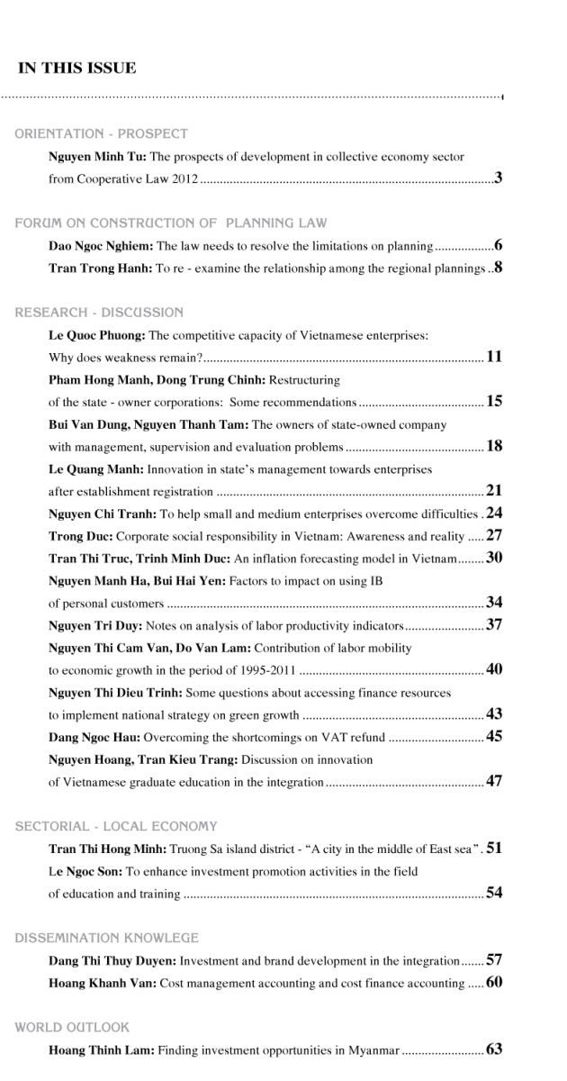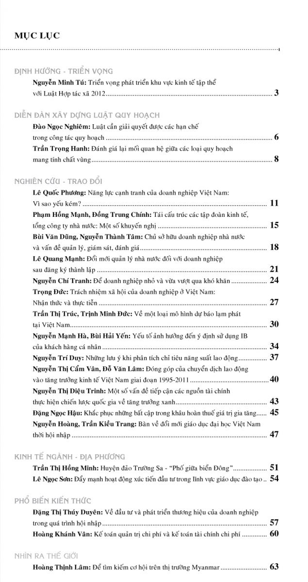 Trong chuyên mục Nghiên cứu – Trao đổisố ra kỳ này là loạt bài về doanh nghiệp nước ta. Mở đầu chuyên mục là bài viết Năng lực cạnh tranh của doanh nghiệp Việt Nam: Vì sao yếu kém?của tác giả Lê Quốc Phương. Bài viết phản ánh những hạn chế khó khăn của doanh nghiệp nước ta trong quá trình hội nhập và phát triển. Tiếp đến là một số bài viết: Tái cấu trúc các tập đoàn kinh tế, tổng công ty nhà nước: Một số khuyến nghịcủa tác giả Phạm Hồng Mạnh, Đồng Trung Chính: Chủ sở hữu doanh nghiệp nhà nước và vấn đề quản lý, giám sát, đánh giá của tác giả Bùi Văn Dũng, Nguyễn Thành Tâm. Đổi mới quản lý nhà nước đối với doanh nghiệp sau đăng ký thành lập của tác giả Lê Quang Mạnh. Để doanh nghiệp nhỏ và vừa vượt qua khó khăncủa tác giả Nguyễn Chí Tranh.Trách nhiệm xã hội của doanh nghiệp ở Việt Nam: Nhận thức và thực tiễncủa tác giả Trọng Đức.