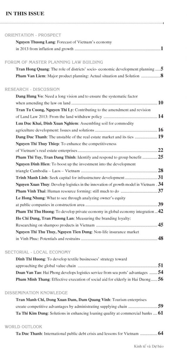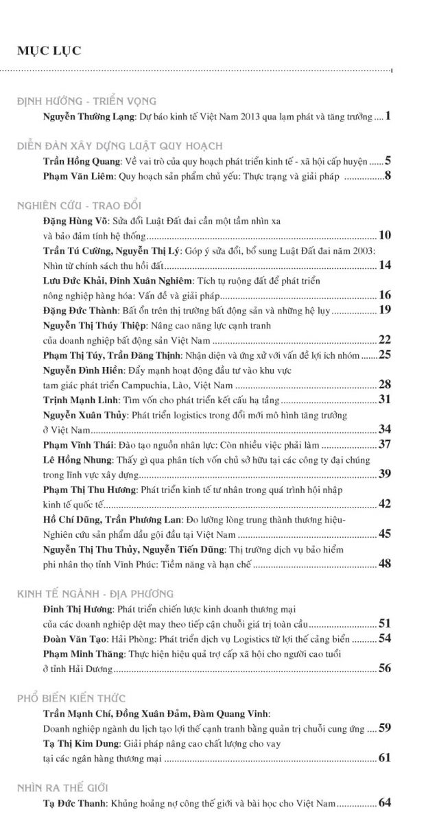 Tiếp đến là loạt bài liên quan đến vấn đề bất động sản, đó là các bài viết của các tác giả: Lưu Đức Khải, Đinh Xuân Nghiêm với bài viết Tích tụ ruộng đất để phát triển nông nghiệp hàng hóa: Vấn đề và giải pháp; Đặng Đức Thành với bài viết Bất ổn trên thị trường bất động sản và những hệ lụy; Nguyễn Thị Thúy Thiệp với bài viết Nâng cao năng lực cạnh tranh của doanh nghiệp bất động sản Việt Nam; Phạm Thị Túy, Trần Đăng Thịnh với bài viết Nhận diện và ứng xử với vấn đề lợi ích nhóm; Nguyễn Đình Hiền với bài viết Đẩy mạnh hoạt động đầu tư vào khu vực tam giác phát triển Campuchia, Lào, Việt Nam; Trịnh Mạnh Linh với bài viết Tìm vốn cho phát triển kết cấu hạ tầng; Nguyễn Xuân Thủy với bài viết Phát triển logistics trong đổi mới mô hình tăng trưởng ở Việt Nam; Phạm Vĩnh Thái với bài viết Đào tạo nguồn nhân lực: Còn nhiều việc phải làm; Lê Hồng Nhung với bài viết Thấy gì qua phân tích vốn chủ sở hữu tại các công ty đại chúng trong lĩnh vực xây dựng; Phạm Thị Thu Hương với bài viết Phát triển kinh tế tư nhân trong quá trình hội nhập kinh tế quốc tế; Hồ Chí Dũng, Trần Phương Lan với bài viết Đo lường lòng trung thành thương hiệu- Nghiên cứu sản phẩm dầu gội đầu tại Việt Nam; Nguyễn Thị Thu Thủy, Nguyễn Tiến Dũng với bài viết Thị trường dịch vụ bảo hiểm phi nhân thọ tỉnh Vĩnh Phúc: Tiềm năng và hạn chế.