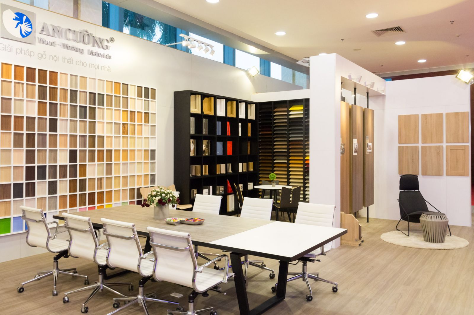 Vật liệu gỗ An Cường sang trọng với hơn 800 màu gỗ có sẵn đa dạng đến ứng dụng kết hợp giữa Gỗ An Cường và phụ kiện Hettich từ Đức: Hệ tủ module bếp, tủ quần áo... giữa không gian nội thất độc đáo với diện tích trưng bày lên đến 90m2 (tương đương 10 gian hàng chuẩn) tại khu A1, Cung Triển lãm Xây dựng Quốc gia, Hà Nội.