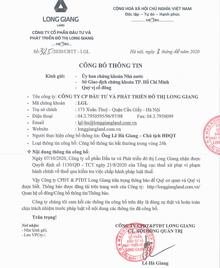 Công ty cổ phần Đầu tư và Phát triển đô thị Long Giang công bố thông tin bị Tổng cục Thuế xử phạt vi phạm hành chính