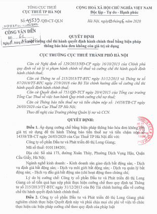 Công ty cổ phần Đầu tư và Phát triển đô thị Long Giang bị Cục Thuế Thành phố Hà Nội cưỡng chế thi hành quyết định hành chính thuế. Nguồn: LGL