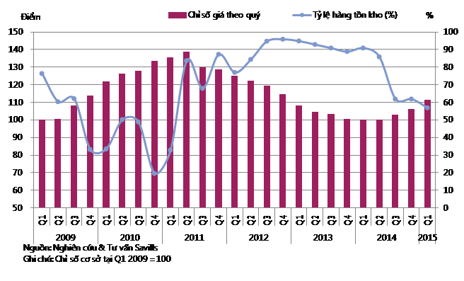 Cụ thể là, chỉ số giá nhà ở quý 1/2015 đạt mức 111 điểm, tăng 5,5 điểm theo quý và 11,5 điểm theo năm. Chỉ số giá nhà ở theo kỳ ở mức 93 điểm trong quý 1/2015, tăng 1,8 điểm so với quý 4/2014. Cả chỉ số giá nhà ở theo quý và theo kỳ cơ bản đều có xu hướng tăng trong quý này. Tỷ lệ hàng tồn kho giảm mạnh -5 điểm phần trăm theo quý và -34 điểm phần trăm theo năm do hoạt động tốt của toàn thị trường vẫn được duy trì. Tỷ lệ hấp thụ đạt mức 43% tăng cả theo quý và theo năm.