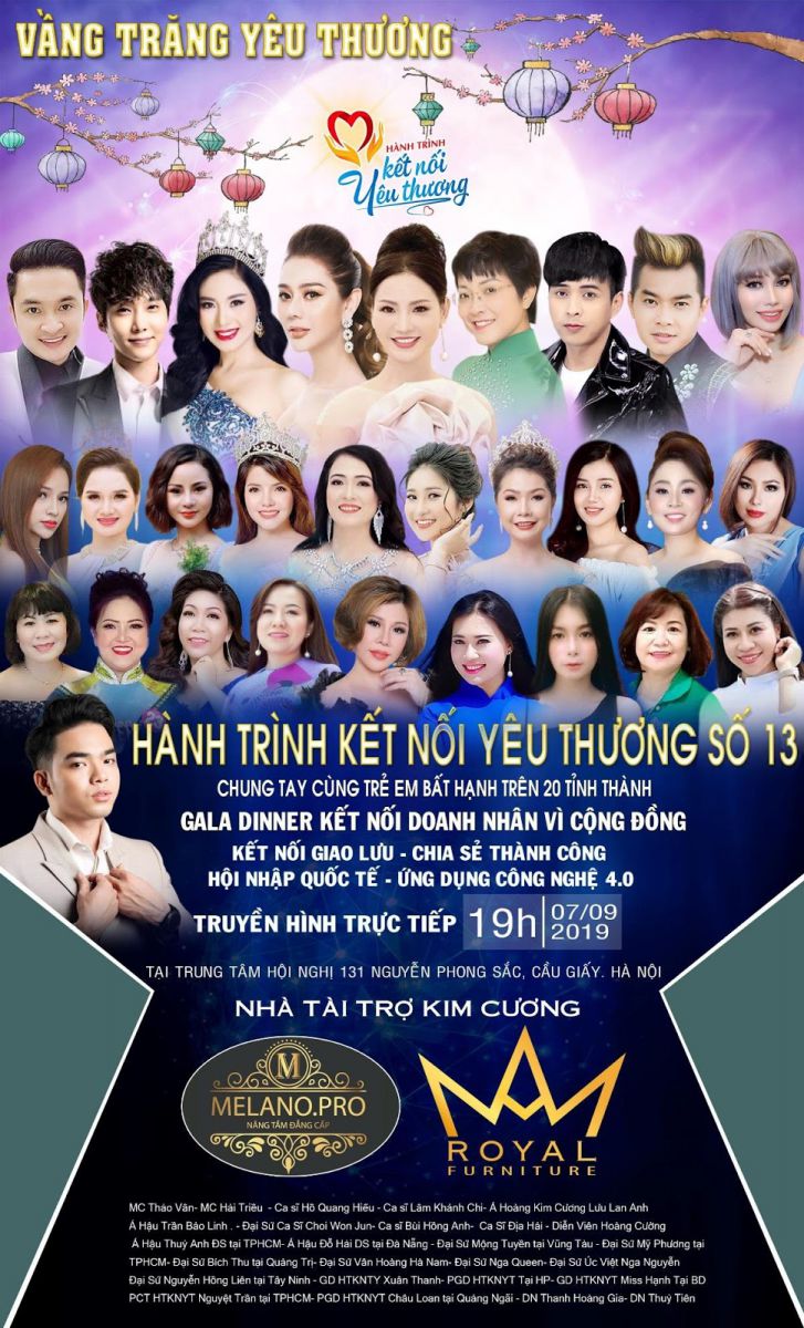 Hành Trình Kết Nối Yêu Thương số 13 đến với Hà Nội Ngày 07/9/2019 với chủ đề “Vầng Trăng yêu thương” chung tay cùng trẻ em bất hạnh trên 63 tỉnh thành. Chương Trình có sự tham dự của Ca sĩ Hồ Quang Hiếu - Lâm Khánh Chi - Ca sĩ Choi Won Jun đại sứ Hành Trình Kết Nối Yêu Thương tại Hàn Quốc - MC Thảo Vân- Ánh Hoàng Kim Cương Lưu Lan Anh cũng là đại sứ HTKNYT tại Hà Nội - Ca sĩ Địa Hải - Diễn viên Ca sĩ Bùi Hồng Anh - Diễn Viên Hoàng Cường - Á Hậu Trần Bảo Linh - Á Hậu Thúy Anh - Á Hậu Hải Đỗ và còn hàng trăm đại sứ Hành Trình Kết Nối Yêu Thương trên 63 tỉnh thành và 5 châu. Họ là hoa hậu, diễn viên, ca sĩ, doanh nhân thành đạt về tham dự.