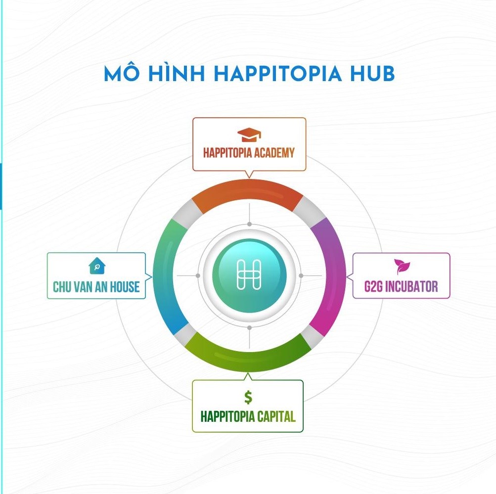 Mô hình của Happitopia Hub được phân theo quá trình từ thai nghén ý tưởng đến thực thi, bao gồm: Học viện Doanh nhân Hạnh phúc – Vườn ươm G2G – Happitopia Capital với không gian, cơ sở vật chất và tiện nghi đầy đủ. Tham gia Happitopia Hub, các doanh nghiệp sẽ nhận được sự dẫn dắt từ các vị chuyên gia đều là các CEO, chủ tịch HĐQT tập đoàn lớn, có cơ hội học hỏi, truyền cảm hứng qua các buổi hội thảo bàn luận về các vấn đề của nền kinh tế, xã hội. Đồng thời đây sẽ là nền tảng xây dựng nên cộng đồng doanh nghiệp “tử tế” – những những start-up phụng sự, start-up hạnh phúc hoạt động không chỉ để kiến tạo nên giá trị hạnh phúc cho bản thân mà còn lan tỏa giá trị hạnh phúc ra xã hội một cách trọn vẹn.