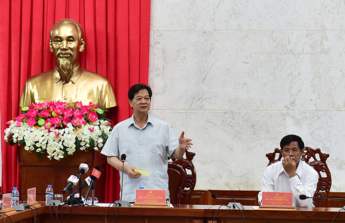 Thủ tướng Nguyễn Tấn Dũng làm việc với lãnh đạo chủ chốt tỉnh Hậu Giang về tình hình kinh tế-xã hội của địa phương. Ảnh: VGP/Nhật Bắc