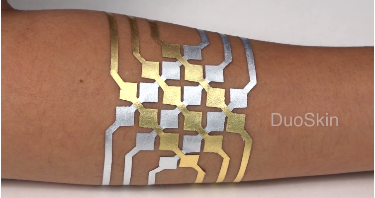 Hãy bắt đầu với ví dụ đầu vào. Hãy suy nghĩ về các thiết bị đầu vào như loại màn hình cảm ứng hoặc trackpad (bàn rê). Ý tưởng là tương tự như dự án Jacquard của Google (gắn cảm biến vào quần áo để có thể chạm lên màn hình lựa chọn đồ ướm thử lên người được). Nhưng với DuoSkin, các cảm biến được gắn trong các hình xăm. Điều này cho phép nó kết nối với một máy tính hoặc điện thoại thông minh, do đó bạn có thể kiểm soát các ứng dụng bằng cách trượt trên các hình xăm.