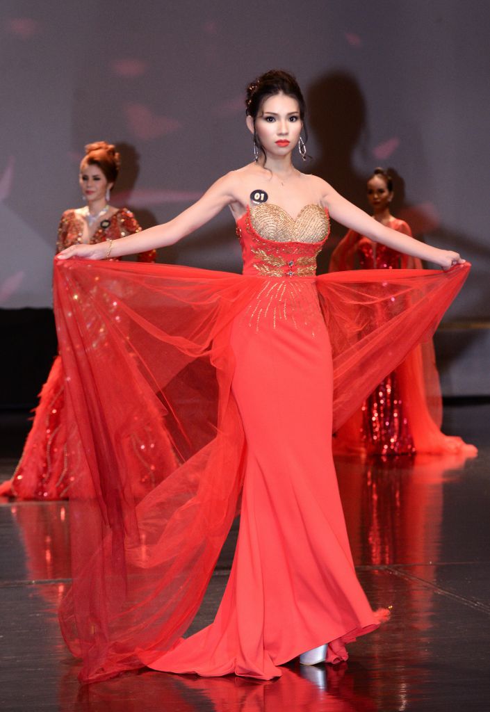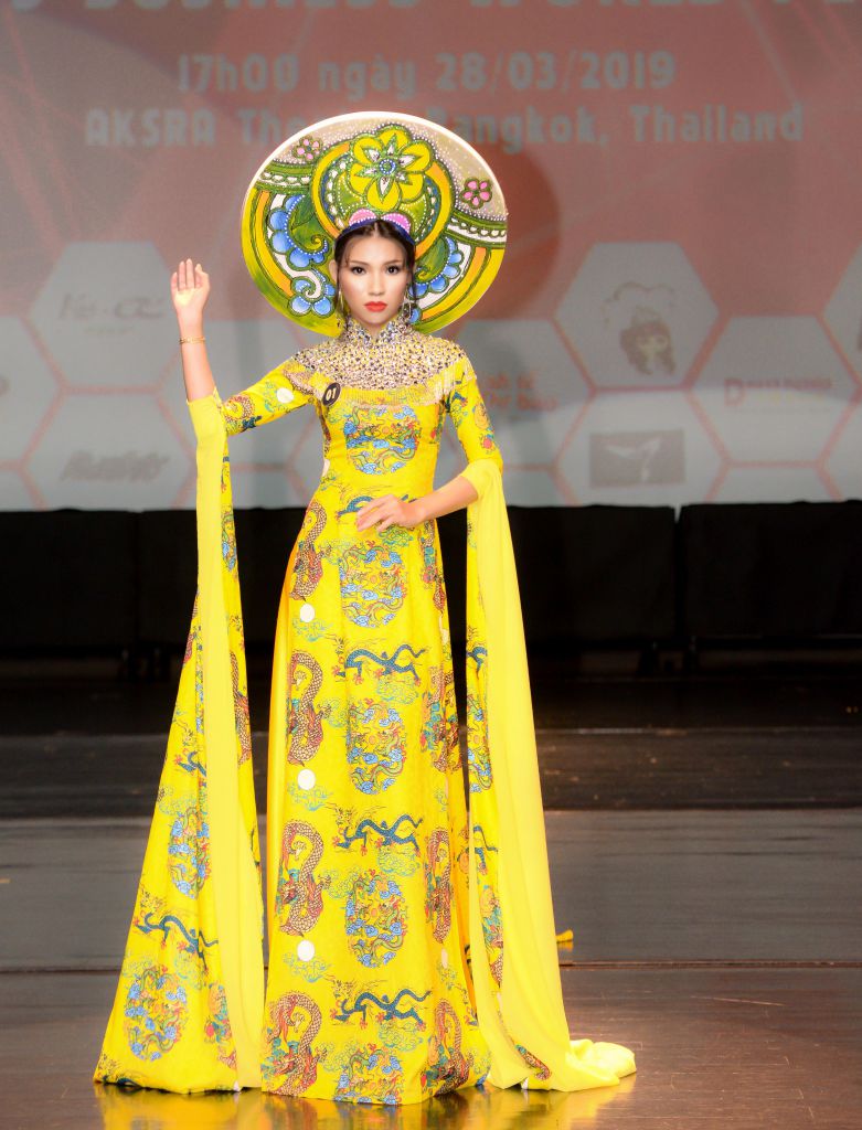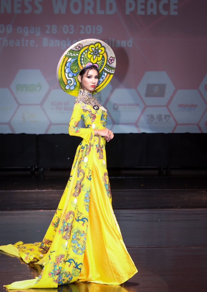 Chọn chiếc áo dài rồng hồn Việt, Huỳnh Trâm thể hiện cảm hứng về cội nguồn, sự hãnh diện về nét đẹp văn hóa của cộng đồng người Việt tại Thái Lan. Thiết kế này cũng giúp cô giành giải Miss Áo dài.