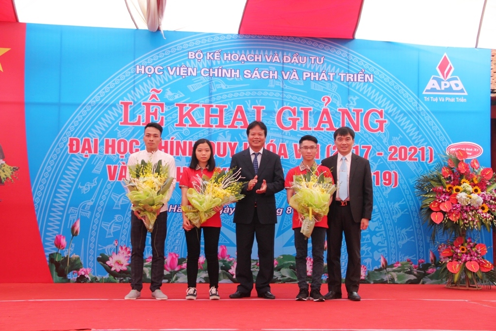 Giám đốc Học viện Chính sách và Phát triển (đứng thứ ba từ trái sang) tặng hoa cho các thủ khoa, á khoa trong kỳ tuyển sinh đại học năm 2017