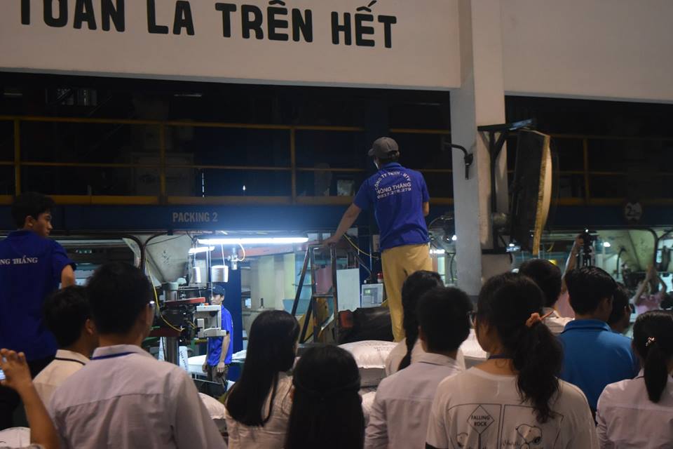Các bạn trẻ được hướng dẫn tham quan nhà máy sản xuất thức ăn dành cho cá