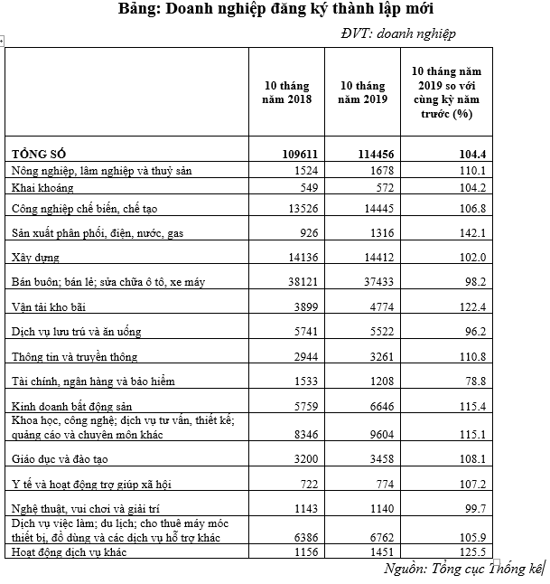Tính chung 10 tháng năm 2019, cả nước có 114,4 nghìn doanh nghiệp đăng ký thành lập mới với tổng số vốn đăng ký là 1.434,4 nghìn tỷ đồng và tổng số lao động đăng ký là 1.024,5 nghìn lao động, tăng 4,4% về số doanh nghiệp, tăng 28,5% về vốn đăng ký và tăng 10,8% về số lao động so với cùng kỳ năm 2018. Vốn đăng ký bình quân một doanh nghiệp thành lập mới trong 10 tháng đạt 12,5 tỷ đồng, tăng 23,1% so với cùng kỳ năm trước. Nếu tính cả 1.893,4 nghìn tỷ đồng vốn đăng ký tăng thêm của 33,1 nghìn doanh nghiệp thay đổi tăng vốn, thì tổng số vốn đăng ký bổ sung vào nền kinh tế trong 10 tháng năm 2019 là 3.327,8 nghìn tỷ đồng.