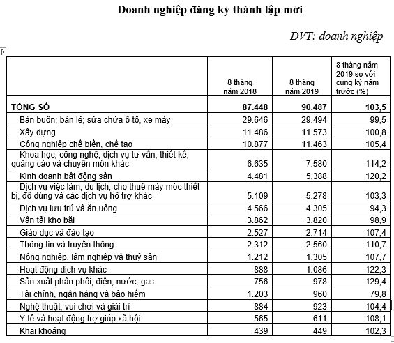 Tính chung 8 tháng năm 2019, cả nước có 90,5 nghìn doanh nghiệp đăng ký thành lập mới với tổng vốn đăng ký là 1.150,7 nghìn tỷ đồng, tăng 3,5% về số doanh nghiệp và tăng 31% về số vốn đăng ký so với cùng kỳ năm 2018. Tỷ trọng vốn đăng ký bình quân một doanh nghiệp thành lập mới đạt 12,7 tỷ đồng, tăng 26,6%. Nếu tính cả 1.603,7 nghìn tỷ đồng vốn đăng ký tăng thêm của các doanh nghiệp thay đổi tăng vốn, thì tổng số vốn đăng ký bổ sung thêm vào nền kinh tế trong 8 tháng năm 2019 là 2.754,4 nghìn tỷ đồng. Tổng số lao động đăng ký của các doanh nghiệp thành lập mới trong 8 tháng năm nay là 832,3 nghìn người, tăng 13,3% so với cùng kỳ năm 2018.