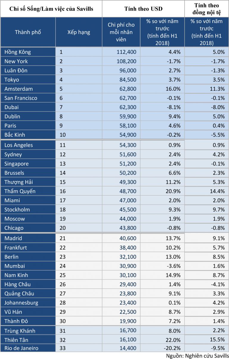 Tại khu vực châu Á. Xét về chi phí sống và làm việc, Hồng Kông đang đứng tại vị trí biệt lập so với các thị trường khác trên toàn châu Á. Tuy vậy, các thành phố tại Trung Quốc cũng đã tăng thứ hạng nhanh chóng trong những năm gần đây. Thành phố đắt đỏ nhất trong số đó là Bắc Kinh có tổng chi phí cho thuê là 54.900USD/người, thấp hơn 1 nửa của Hồng Kông, giảm -0,2% (-5,5% nếu tính theo đồng nội tệ) so với năm trước, nhờ các biện pháp bình ổn thị trường đã và đang được triển khai. Thâm Quyến đã tăng từ vị trí thứ 20 lên vị trí thứ 16 trong bảng chỉ số của Savills, trở thành một trong những thành phố có sự nhảy vọt đáng kể nhất trong thứ hạng. Chi phí tăng 14,4% tính theo đồng nội tệ và 20,9% tính theo đô la Mỹ, lên mức 48.700USD, đứng sau Thượng Hải, nơi chi phí dừng lại ở ngưỡng 49.300USD/năm. Quy mô dân số tăng do luồng di cư nội địa tạo động lực thúc đẩy giá thuê nhà tại thành phố tiếp tục tăng. Nhu cầu thuê văn phòng vẫn giữ ở mức cao, đặc biệt là từ lĩnh vực dịch vụ tài chính, dịch vụ công nghệ cao, các ngành sản xuất công nghệ tiên tiến, và các đơn vị vận hành không gian làm việc chung (co – working).