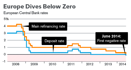 Các quan chức của ECB cho rằng nền kinh tế cần thêm kích thích để ngăn chặn kịch bản giảm phát – tình trạng giá hàng hóa sụt giảm và làm chệch hướng đà phục hồi vốn đang rất mong manh. ECB giảm lăi suất tiền gửi từ 0 xuống -0,1%, đồng thời giảm lăi suất cơ bản xuống mức thấp kỷ lục 0,15%. Lăi suất tiền gửi âm sẽ giúp ích cho nền kinh tế bằng cách đẩy đồng Euro xuống thấp hơn.