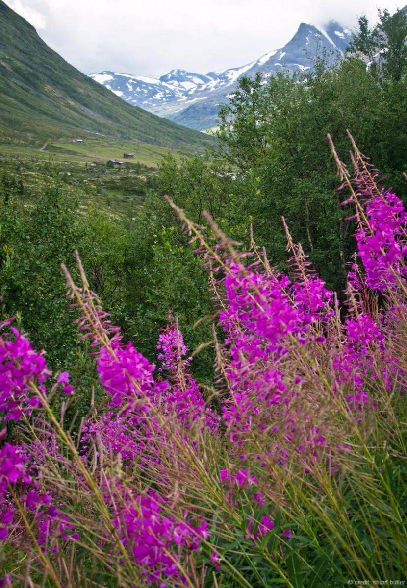 Cung đường Sognefjellet yên tĩnh rời khỏi phố núi bận rộn Lom, chạy dọc theo sông Bover. Phong cảnh thung lũng Gentle nhẹ nhàng hiện lên, thỉnh thoảng lấp ló những đỉnh núi tuyết cao phía trước. Phần lớn thời gian cung đường này vị vùi lấp sâu dưới lớp tuyết dày đặc cả mét. Cung đường chỉ mở cửa hoạt động vào giữa tháng 5 và tháng 9 . Đi qua nửa đầu của tuyến đường vào khoảng đầu tháng tám, những thảm cỏ xanh nơi đất thấp được phủ đầy sắc của loài hoa tím, sắc hoa yên bình thiên nhiên ban tặng.