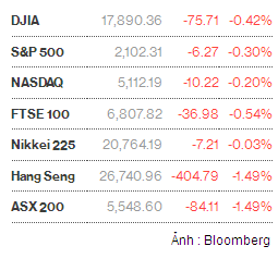 Kết thúc phiên 25/6, chỉ số Dow Jones giảm 75,71 điểm (-0,42%), xuống 17.890,36 điểm. Chỉ số S&P 500 giảm 6,27 điểm (-0,3%), xuống 2.102,31 điểm. Chỉ số Nasdaq giảm 10,22 điểm (-0,2%), xuống 5.112,19 điểm.