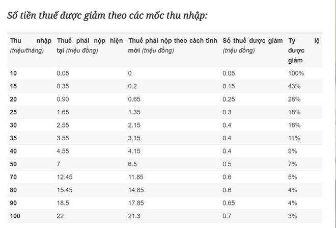Tương tự, người có thu nhập 20 triệu/tháng và 1 người phụ thuộc, hiện phải nộp 490.000 đồng tiền thuế mỗi tháng (2,5% thu nhập). Mức tiền phải nộp tính theo giảm trừ gia cảnh mới sẽ là 230.000 đồng (1,2% thu nhập), giảm hơn 48%.