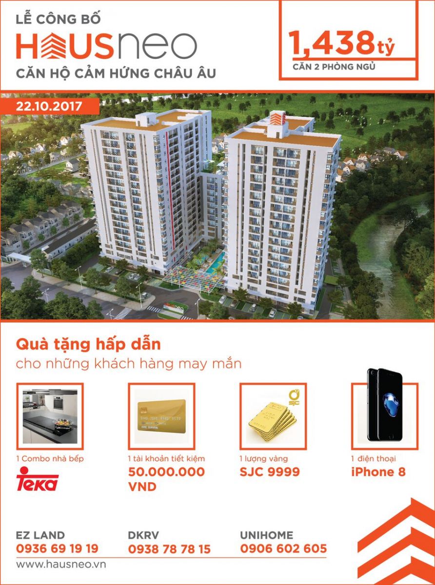 | Dự án căn hộ HausNeo Chủ đầu tư : Công ty cổ phần phát triển EZ Land Việt Nam Vị trí dự án: KDC Phú Hữu, Đường Liên Phường, Phường Phú Hữu, quận 9, liền kề nút giao Cao tốc Long Thành – Dầu Giây và đường Vành đai 2. Nhà thầu: COFICO Diện tích dự án: Hơn 8.000 m2 Mật độ xây dựng: Hơn 30% Quy mô: 18 tầng gồm 560 căn hộ và 8 shop houses Loại hình căn hộ: Từ 1 – 3 PN Thời gian giao nhà dự kiến: Quý 3/2019 Dự án HausNeo sẽ tiến hành buổi lễ công bố vào ngày 22/10/2017. Để tìm hiểu thêm về thông tin buổi lễ công bố, độc giả vui lòng truy cập tại link http://Hausneo.vn/ hoặc liên hệ hotline công ty EZ Land 0936 69 19 19, công ty UniHomes 0906602605 và công ty DKRV 0938787815 để được tư vấn. |