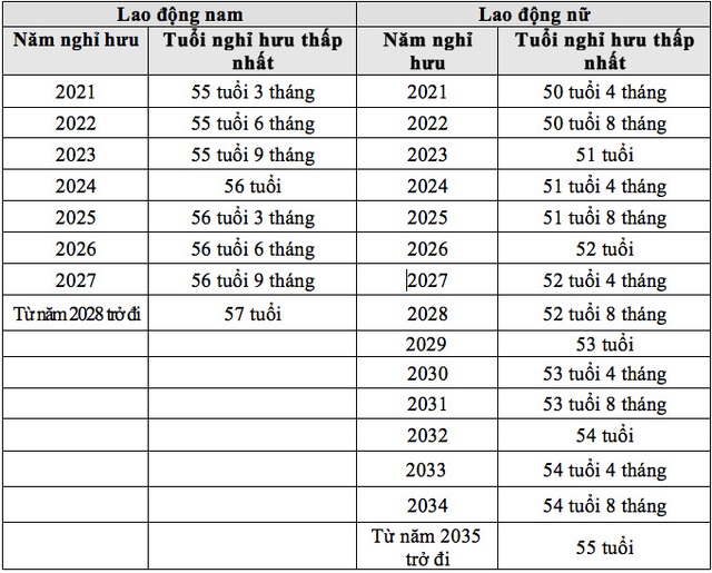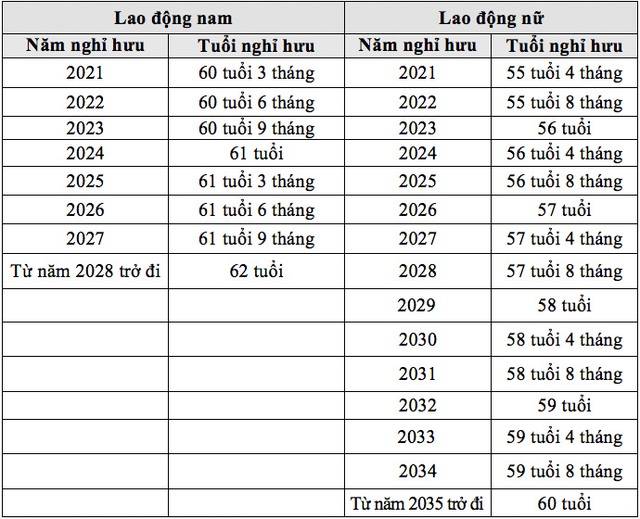 Theo đó, tuổi nghỉ hưu của người lao động bình thường theo khoản 2, Điều 169 của Bộ luật Lao động được quy định cụ thể như sau: kể từ ngày 01/01/2021, tuổi nghỉ hưu của người lao động trong điều kiện lao động bình thường là đủ 60 tuổi 3 tháng đối với lao động nam và đủ 55 tuổi 4 tháng đối với lao động nữ. Sau đó, cứ mỗi năm tăng thêm 3 tháng đối với lao động nam cho đến khi đủ 62 tuổi vào năm 2028 và cứ mỗi năm tăng thêm 4 tháng đối với lao động nữ cho đến khi đủ 60 tuổi vào năm 2035.