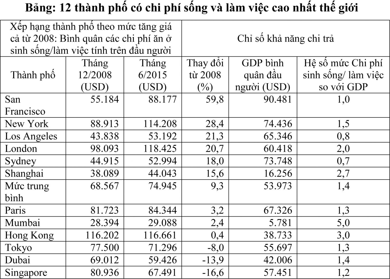 Theo đó, tính đến tháng 06/2015, mức chi phí bình quân ăn ở sinh sống/làm việc tính theo đầu người tại London là 118.425 USD, tiếp theo là Hong Kong với 116.661 USD, New York là 114.208 USD. Trong khi đó, các thành phố còn lại đều có mức bình quân dưới 90.000 USD. Thành phố với mức chi phí thấp nhất trong bảng xếp hạng 12 thành phố là Mumbai, nơi doanh nghiệp chi khoảng 29.088 USD để trang trải cho một nhân viên (Bảng).
