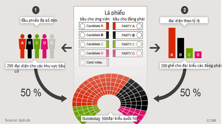 Về danh nghĩa, hạ nghị viện Đức có 598 ghế (đây là số lượng để tổ chức bầu cử, sau khi bầu có thể nhiều hơn), nhiệm kỳ 4 năm. Một nửa số thành viên của hạ nghị viện được bầu chọn trực tiếp từ 299 đơn vị bầu cử theo phương pháp bầu cử đại diện theo đa số. Mỗi đơn vị bầu cử được bầu một ghế đại diện. Trong số các cá nhân do các đảng giới thiệu và ứng cử viên độc lập, ai giành được nhiều phiếu nhất sẽ trúng cử tại khu vực bầu cử.