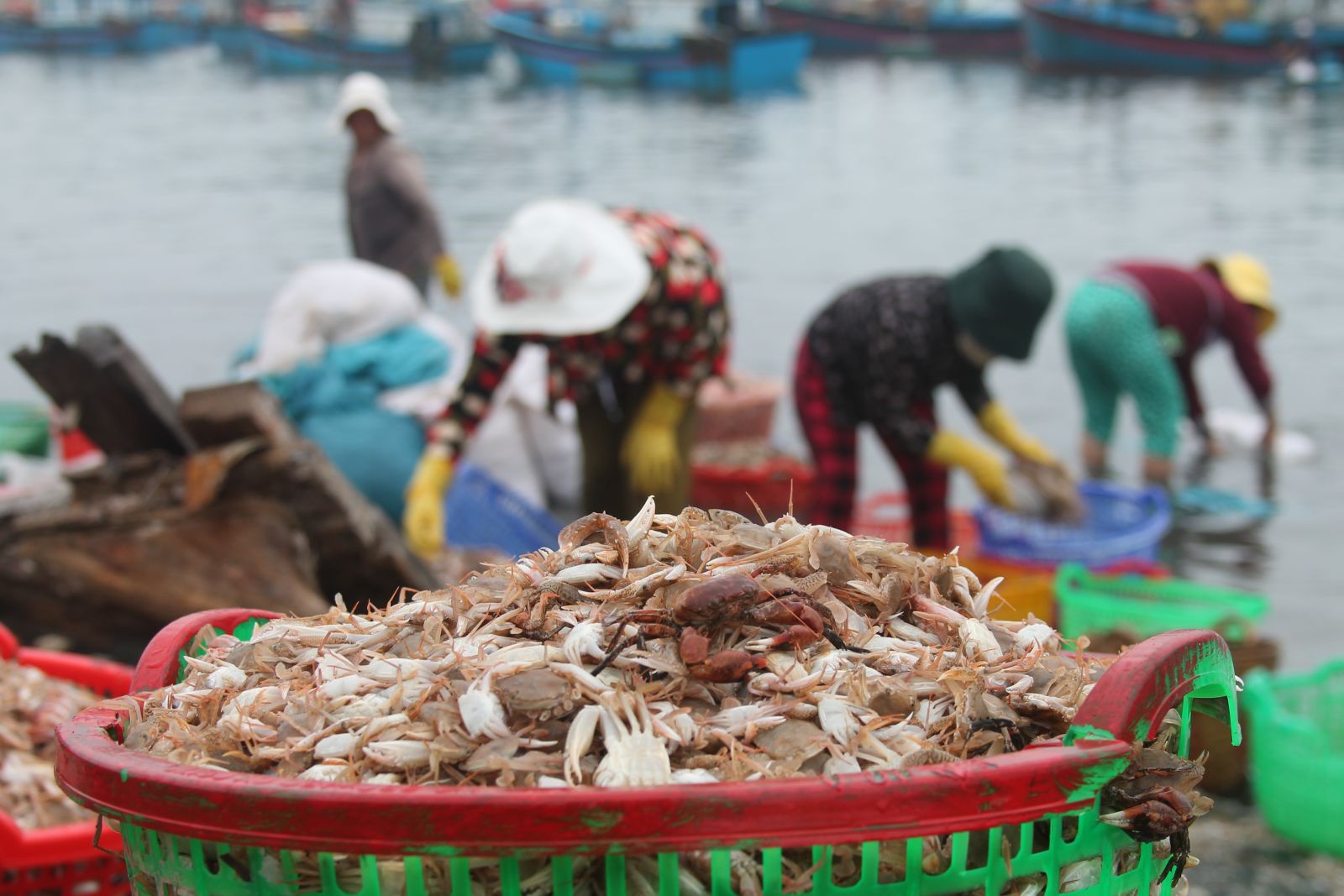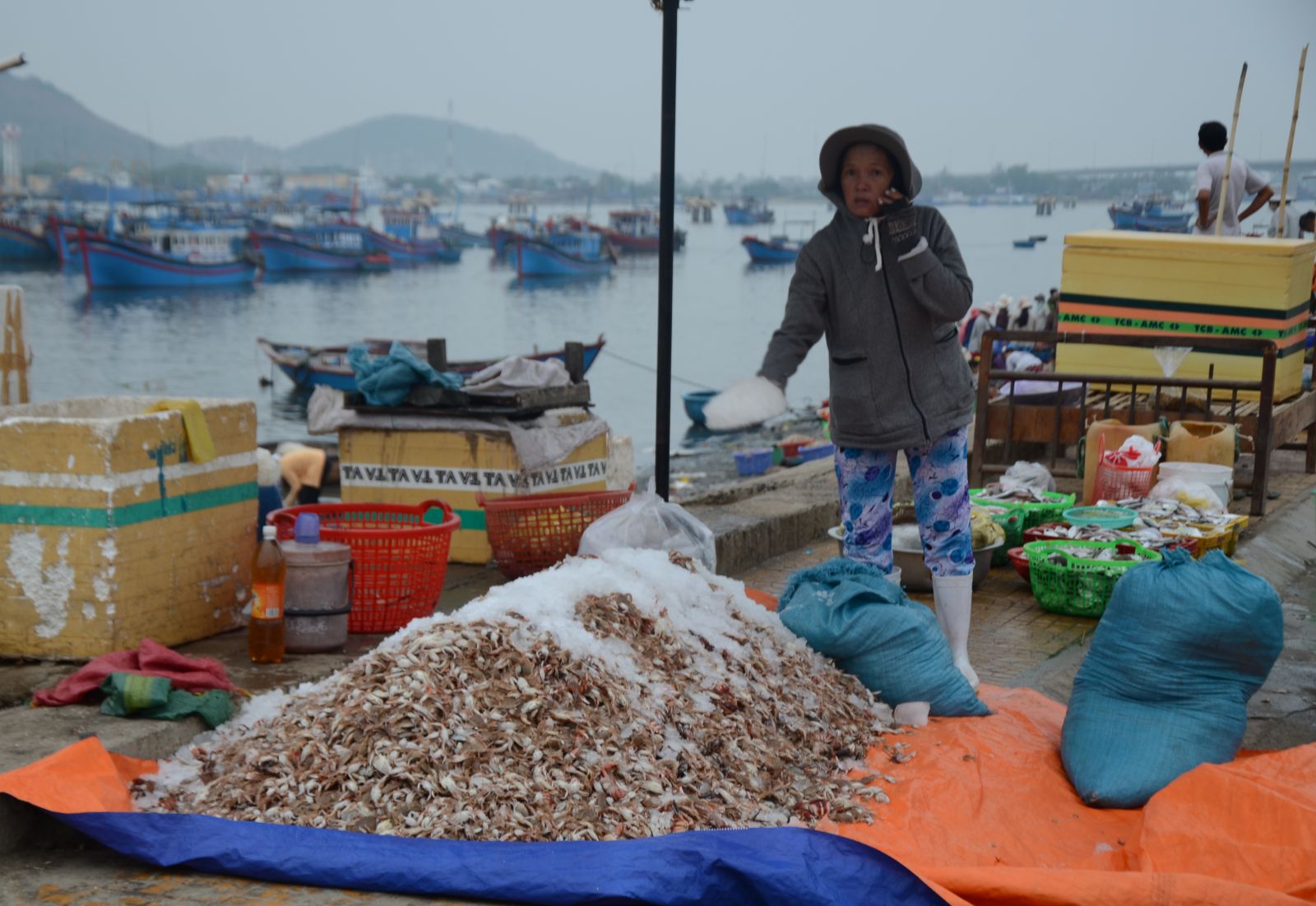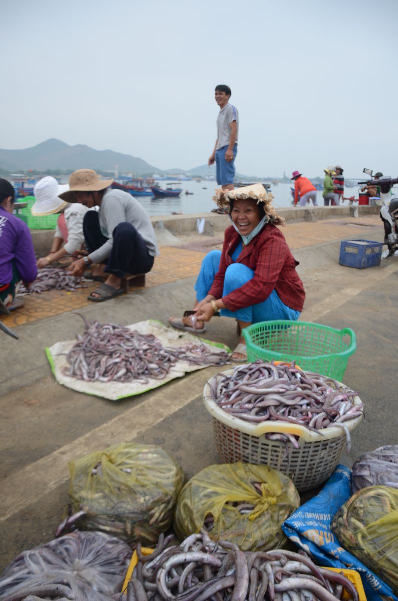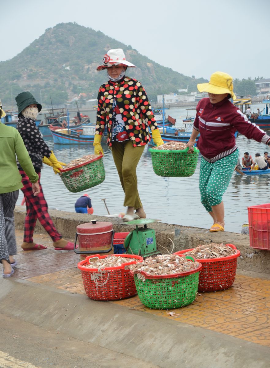 Những người phụ nữ hàng chài đang sàng lọc lại sản vật từ biển trước khi giao dịch buôn bán.