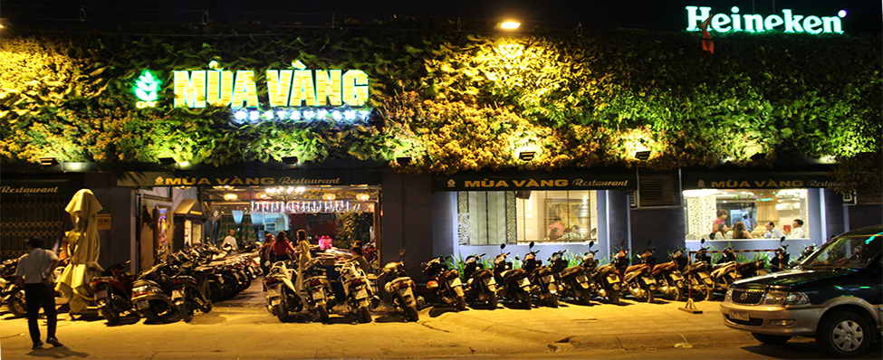 Nằm ở vị trí thuận lợi, dễ tìm, Mùa Vàng ghi dấu đầu tiên ở khu vườn tự nhiên trang trí phía bên ngoài rộng rãi, thoáng mát vừa làm dịu bớt đi cái oi bức của Sài Gòn, vừa tạo một điểm nhấn đặc biệt cho nhà hàng. Ban ngày đến Mùa Vàng là một nơi lý tưởng để bạn có một không gian xanh mát, ẩn mình sau những ồn ào của thị thành, hòa mình với thiên nhiên và thưởng thức những món ăn ngon. Ban đêm, Mùa Vàng chuyển mình kiêu sa với những ánh đèn màu rực rỡ nhưng cũng rất hài hòa với chiếc áo xanh tinh khiết.