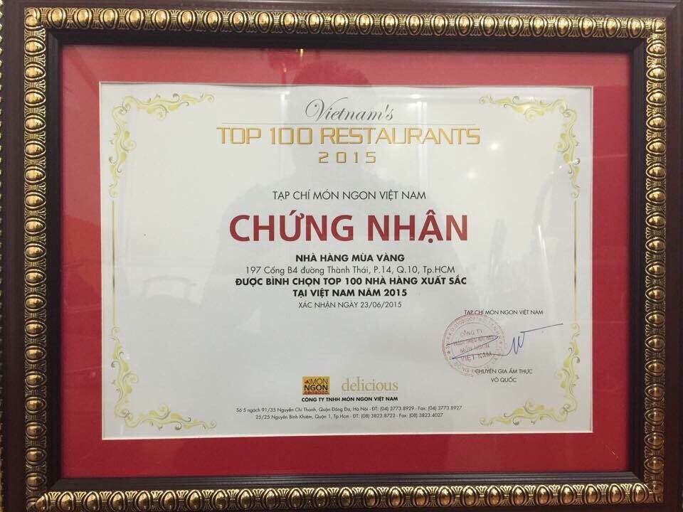 Đảm bảo các tiêu chí: Không gian tốt, món ăn ngon, giá tiền hợp lý, cung cách phục vụ nhiệt tình, tận tâm đã giúp Mùa Vàng ngày càng phát triển hơn và đã được Tạp Chí Món Ngon Việt Nam bình chọn Top 100 nhà hàng xuất sắc tại Việt Nam 2015.