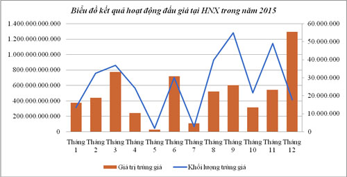 Nhờ đó, hoạt động đấu giá trên Sở GDCK Hà Nội trong năm 2015 diễn ra sôi động. Tổng kết năm 2015 có tất cả 93 phiên (cao gấp 1,7 lần số phiên đấu giá năm 2014) được thực hiện. Trong đó: 64 phiên bán cổ phần lần đầu ra công chúng, 24 phiên bán bớt phần vốn Nhà nước, 4 phiên bán cổ phần theo phương thức thỏa thuận trực tiếp với những nhà đầu tư đã tham dự đấu giá và 1 phiên đấu giá quyền mua.