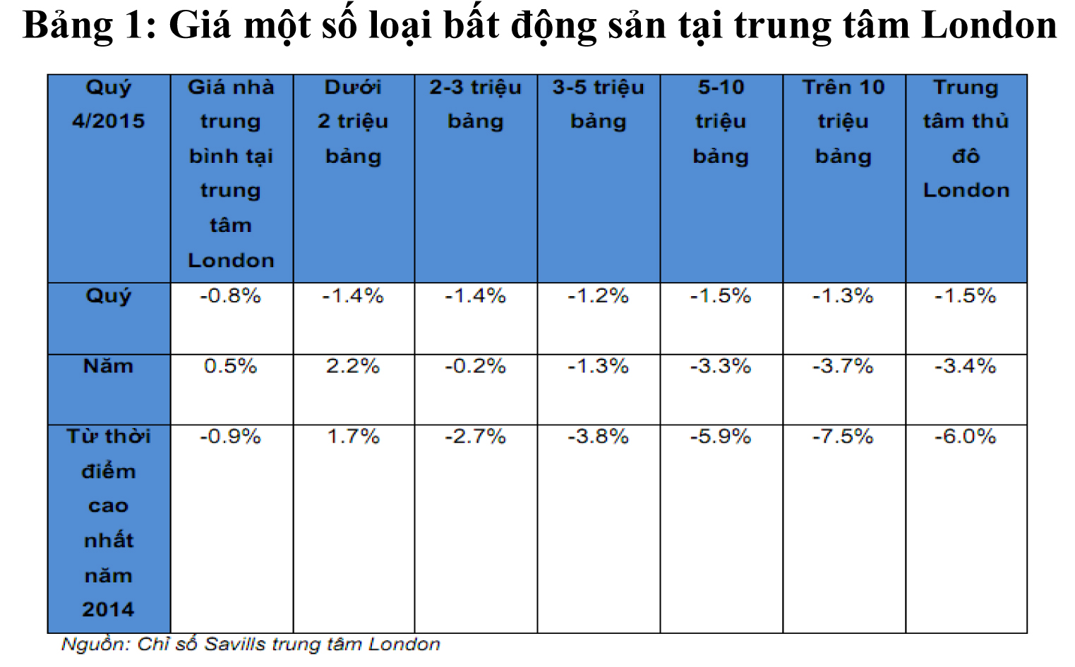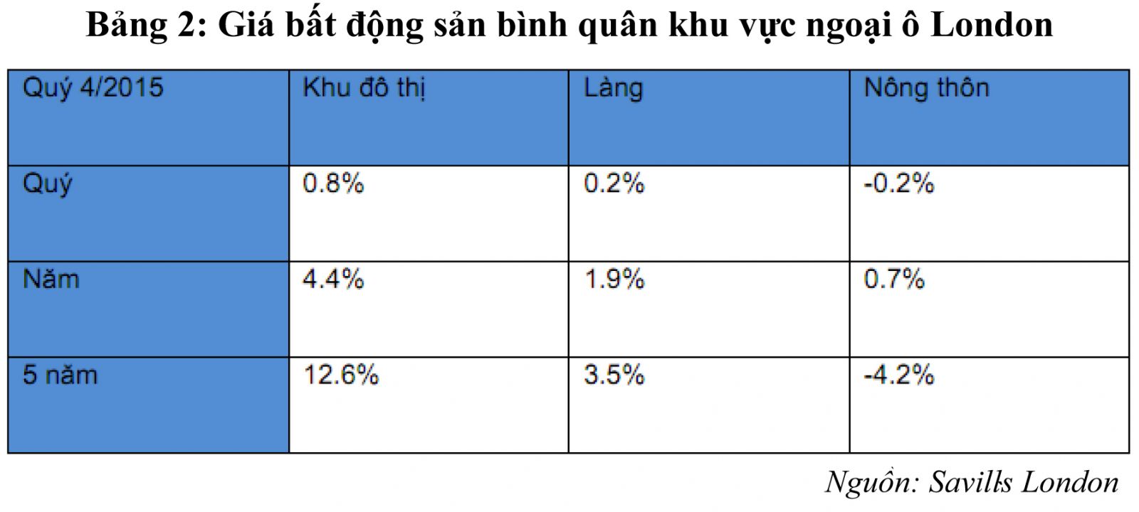 Quý 4/2015, giá nhà tại khu trung tâm London đã giảm xuống mức trung bình -0,8%, thấp hơn 0,5% so với quý 1/2015. Tuy nhiên, tốc độ tăng trưởng của khu vực trung tâm Thành phố và ngoại ô đạt trung bình 4,4% hàng năm.