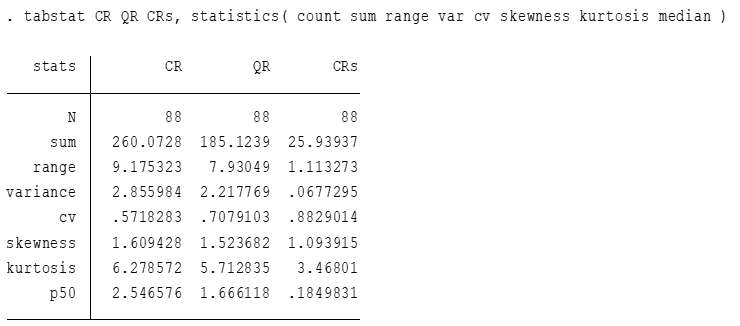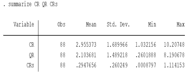 Bảng 2 và Bảng 3 cho thấy khả năng thanh toán bao gồm 3 biến quan sát; mỗi biến quan sát được mô tả bằng 88 quan sát (obs); các chỉ số cơ bản như giá trị trung bình (mean), giá trị lớn nhất (max), giá trị nhỏ nhất (min), độ lệch chuẩn (sd), phương sai (variance), hệ số bất đối xứng (skewness), hệ số độ nhọn (kurtosis), mức độ phân phối là tập trung hay phân tán (p50), tổng các giá trị của biến (sum), khoảng biến thiên (range), hệ số biến thiên (cv) của từng biến quan sát đã được xác định và các chỉ số cơ bản này phản ánh đúng thực trạng về khả năng thanh toán của các doanh nghiệp dược phẩm niêm yết trên thị trường chứng khoán Việt Nam.