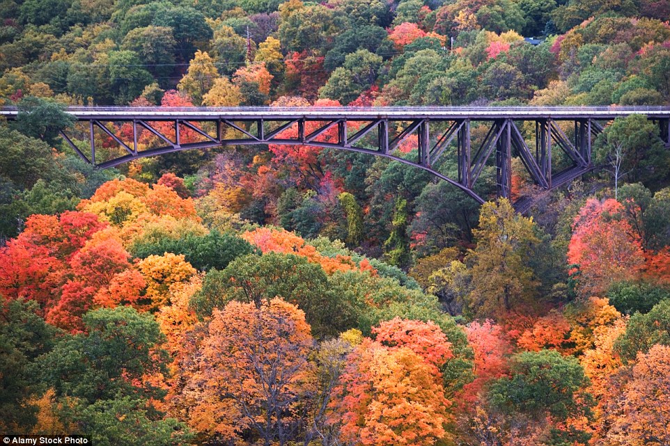 Biển màu huyền ảo với nhiều màu sắc bao quanh một cầu tại Bear Mountain ở New York trong mùa mùa thu.