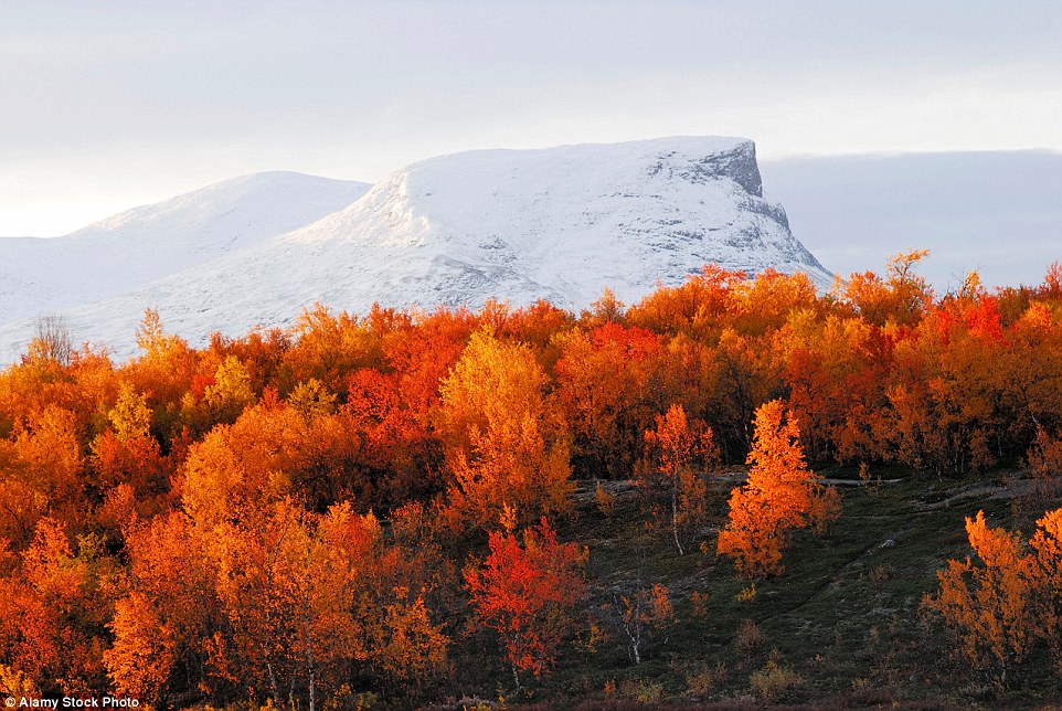 Cây cối mùa thu đậm màu đỏ ở Vườn Quốc gia Thụy Điển Abisko đối nghịch với những ngọn núi tuyết phủ lên phía trên chúng.